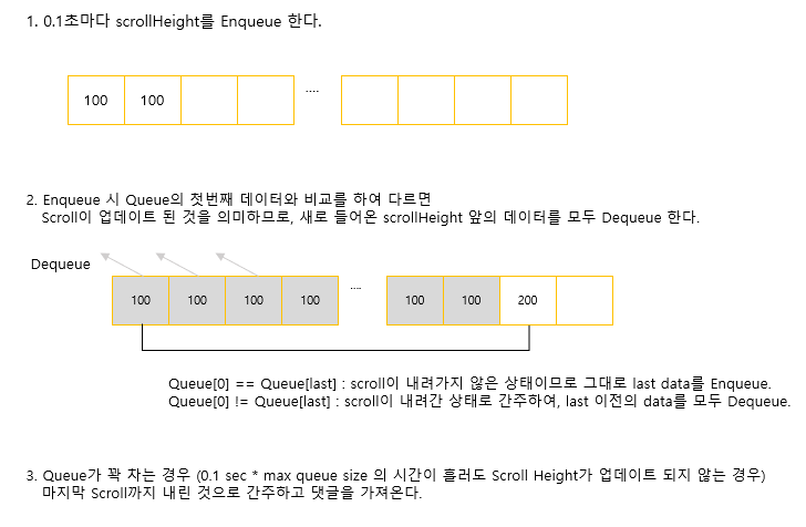 # 같으면 그대로 Enqueue, 다르면 Queue의 모든 Data를 Dequeue 후 새로운 Scroll Height를 Enqueue 함.