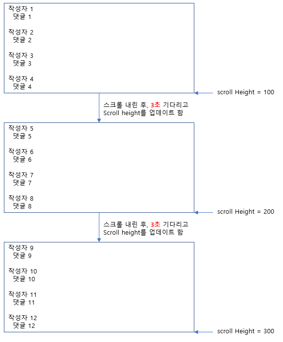 # Queue에 가장 먼저 들어온 데이터와 새로 업데이트 된 Scroll Height를 비교함
