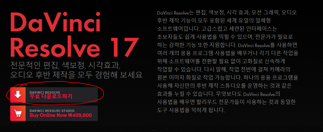 1. https://www.blackmagicdesign.com/kr/products/davinciresolve/ 접속