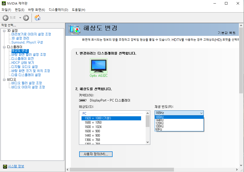 따라서 NVIDIA 제어판에서 반드시 주사율을 확인하신 후 설정을 해주셔야 합니다.
