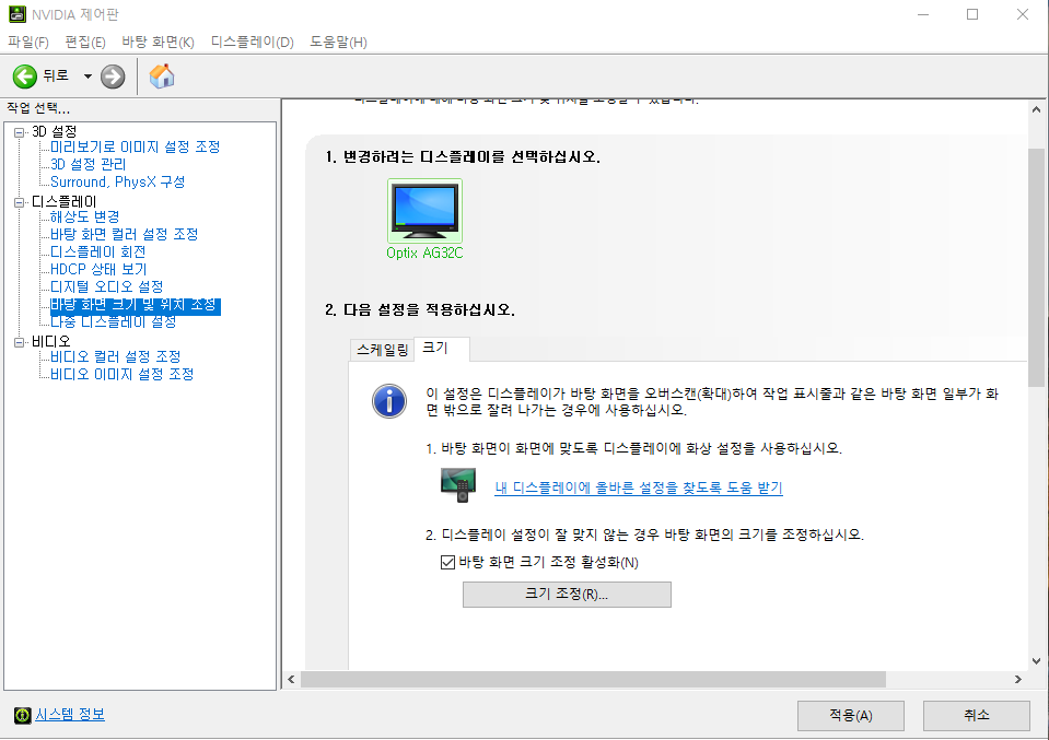 - 디스플레이 > 바탕 화면 크기 및 위치 조정 > 크기 탭 > 바탕 화면 크기 조정 활성화 > 크기 조정