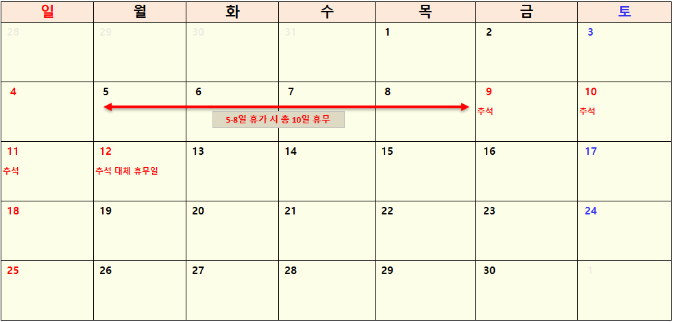 - 추석 (9월 9일 ~ 9월 12일) : 금요일 ~ 일요일 (대체 공휴일 : 월요일)
