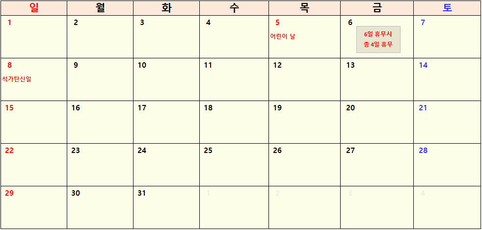 - 석가탄신일 (5월 8일) : 일요일