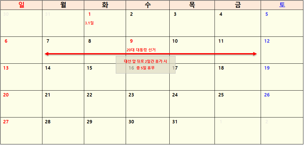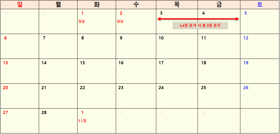 - 3월 5일(토) ~ 3월 9일(수) : 휴가 2일 사용 시 총 5일 휴무 가능