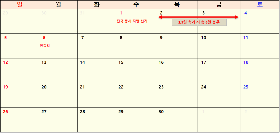 - 6월 1일(수) ~ 6월 6일(월) : 휴가 2일 사용 시 총 6일 휴무 가능