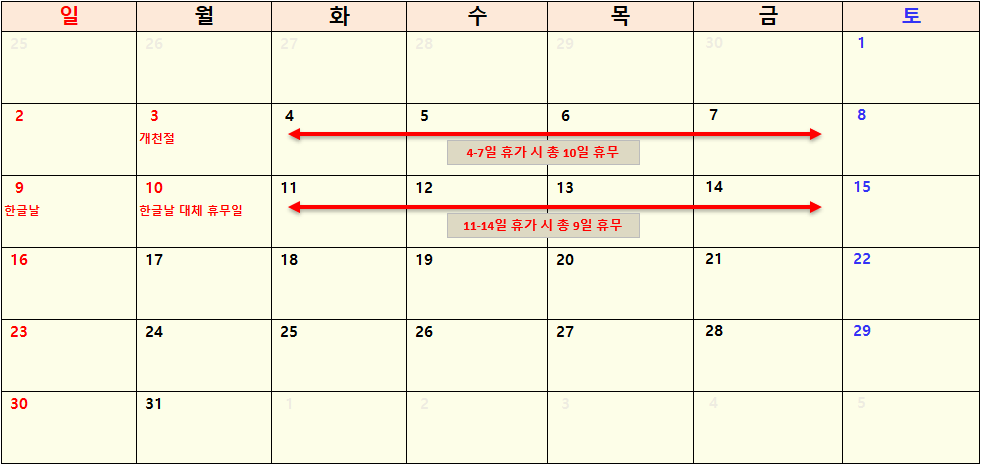 - 10월 1일(토) ~ 10월 10일(화) : 휴가 4일 사용시 총 10일 휴무 가능